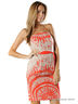 Льняное платье - бандо длиной по колено, с отрезной линией талии, двумя функциональными карманами и защипами спереди. Платье украшено ярким фольклорным орнаментом и контрастным широким текстильным поясом.