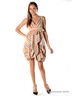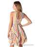 Платье из тканного полотна на широких бретелях, с отрезной линией талии, открытой зоной спины и декольте. Изделие декорировано широким поясом, сборками на защипах и ярким принтом в контрастную полоску.
