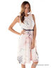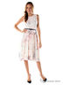 Легкое платье без рукавов, с отрезной линией талии. Платье декорировано защипами, контрастным принтом и функциональным текстильным поясом.