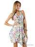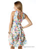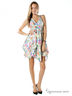 Свободное летнее платье средней длины без рукавов, с высокой отрезной линией талии и глубоким V-образным вырезом горловины. Платье украшено ярким принтом с изображением разноцветных ключей, оборками на пуговицах и вшитым текстильным поясом, завязывающимся вокруг груди и талии.
