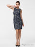 Платье длиной по колено, с круглым вырезом горловины, без рукавов, на широких бретелях, с отрезной линией талии. Платье декорировано драпировкой, длинной молнией во фронтальной части и трафаретным принтом в темных тонах.