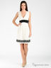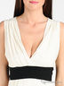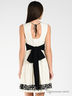 Приталенное платье на бретелях, с глубоким вырезом зоны декольте и спины, декорировано контрастным принтом "в полоску" и функциональным поясом. Юбка в широкую складку украшена ажурной аппликацией по нижнему канту.