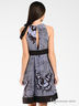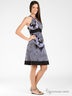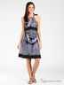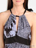 Короткое трикотажное платье без рукавов, с отрезной талией, открытой зоной декольте и спины, декорировано однотонными широкими полосами и контрастным абстрактным принтом.