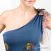 Стильное трикотажное платье через одно плечо. Низ платья и рукав декорированы рюшами из сетчатого материала. Спереди оригинальный принт, декорированный стразами.