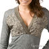 Элегантное трикотажное платье,отрезное по линии талии и длинными рукавами. У платья V-образный вырез горловины с эффектом запаха. Лиф платья украшает цветочный узор.