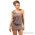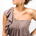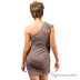 Стильное асимметричное платье из эластичного трикотажа. Один рукав украшают мягкие воланы, от груди, украшенной цепочкой, идут складки.