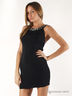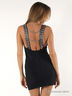 Коктейльное платье с округлым вырезом. Верх декорирован вставкой с металлическими заклепками, которая на спине переходит в две бретели, соединенные цепочками.