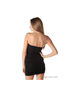 Однотонное платье без бретелей, с лифом"пуш ап", декорировано узором - аппликацией, выполненным из страз и металлических деталей.