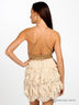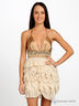 Короткое коктейльное платье на бретелях, с глубоким декольте и открытой спиной. Линия талии украшена крупными кристаллами, стразами и бисером.