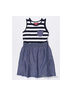 Замечательное комбинированное платье для девочки без рукавов с округлым вырезом горловины. Декорирована модель широкой резинкой на талии и накладным карманом на груди. Изделие выполнено в привлекательной расцветке. Отличный вариант на каждый день.