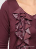 Платье с рукавами 3/4 и округлым вырезом горловины. Модель приталенного кроя. Изделие выполнено из качественного материала привлекательной расцветки и дополнено спереди рюшами. Отличный вариант на каждый день.