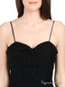 Детали: платье на тонких лямках, отрезное по линии талии, лиф украшен присбореной тканью, классическая юбка длинной до колена, внешняя часть юбки выполнена сетчатой тканью, по поясу небольшая сборка.