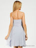 Детали: платье на тонких бретелях, отрезное по линии талии, классическая юбка длиной чуть выше колена, лиф украшен присбореной тканью.