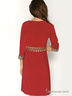 Яркое платье из мягкого материала. V-образный вырез горловины с запахом. Отрезной лиф. Прямые рукава длиной до локтя. Свободная юбка. Талия подчеркивается отрезным эффектным поясом. Пояс и вставки на рукавах выполнены из яркой, контрастной ткани. Будьте всегда в центре внимания!