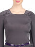 Рисунок мелкого горошка очень современно выглядит на нежной трикотажной ткани, насыщенного сиреневого оттенка. Крой рукава-реглан подчеркнут мягкими защипами. В комплект к платью идет элегантный ремешок подчеркивающий талию.