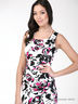 Приталенная модель чуть выше колена. Отрезной пояс. Цветочные принты.