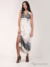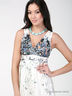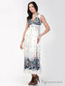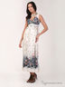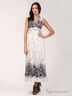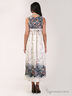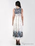 Расклешенная модель с V-образным вырезом горловины. Отрезной лиф. Изделие украшено принтами.