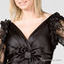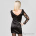 Глубокий вырез горловины с запахом, спинка оголена, рукава длинные выполнены из отделочной полупрозрачной ткани, длина мини-юбки, декоративный бант с лицевой стороны, рукава декорированы воланом.