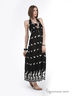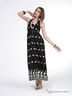 Расклешенное летнее платье в пол. V-образный вырез горловины, открытая спина, лямки, принты.