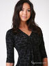 Элегантное и игривое трикотажное платье с черным принтом в виде пятен жирафа. Выполнено из теплого и приятного на ощупь материала. V-образный вырез. Отрезной лиф, присборенный на полочке, прекрасно подчеркивает грудь. Рукава 3/4.