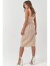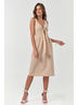 Особенности: Платье полуприлегающего силуэта из плательной ткани. Детали: широкие бретели со сборкой на резину по спинке, драпировка попереду с широкой шлевкой, в которую продернута завязка, притачной пояс по талии, боковые карманы. Застежка на молнию в боковом шве.