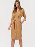 Особенности: Платье прилегающего силуэта из плательной ткани. Детали: цельновыкроенный рукав "летучая мышь", по талии переда застроченные защипы, боковые карманы, шлевки по линии талии, пояс с пряжкой из основной ткани. Сквозная застежка на пуговицы по переду.