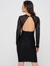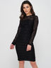 Платье прилегающего силуэта из кружева, частично на подкладке. Детали: по переду - фигурные вытачки, длинный втачной рукав; по спинке - фигурный вырез, застежка на петлю-пуговицу по горловине и на потайную молнию по юбке.