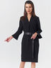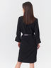 Платье прямого силуэта из плательной ткани. Детали: V-образный вырез горловины со складкой, втачной рукав с защипами по низу и притачной расклешенной манжетой. Декоративный пояс из плотной ленты с металлической пряжкой в комплекте.