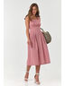 Особенности: Платье приталенного силуэта из хлопковой ткани. Детали: отрезной лиф со складками по переду и широкими бретелями, перекрещивающиеся на спине, широкий притачной пояс, защипы по юбке, боковые карманы. Застежка на пуговицу по спинке.