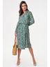 • Особенности: Платье из струящейся принтованной ткани. Детали: отложной воротник, запах, сборка на резинку по талии, два пояска с металлическими пряжками. Рукав втачной, длинный.