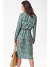 • Особенности: Платье из струящейся принтованной ткани. Детали: отложной воротник, запах, сборка на резинку по талии, два пояска с металлическими пряжками. Рукав втачной, длинный.
