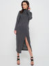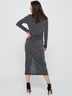 Платье прямого силуэта из фактурного трикотажа. Детали: цельнокронный воротник-стойка, длинный втачной рукав, запах по переду. Без застежки.