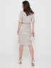 Платье из ткани с люрексом. Отрезное по талии. Детали: кокетка по спинке переходящая на перед, рукав втачной, по переду имитация запаха, по талии сборка на резину, отлетная часть юбки выполнена с удлинением. Без застежки.