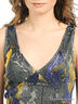 Легкое, зауженное женское платье, расклешенное к низу. Изделие украшено ярким принтом.
