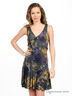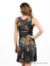 Легкое, зауженное женское платье, расклешенное к низу. Изделие украшено ярким принтом.