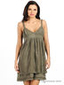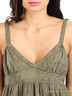 Детали: платье на бретельках, юбка расклешенная присборена, застежка по спинке на пуговицах, юбка двойная: внешняя часть чуть короче внутренней. Ткань декорирована вышивкой в виде цветов.