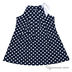 По-летнему очаровательное платье-трапеция с американской проймой. Вырез горловины завязывается на декоративный бант. Модная расцветка в горошек.