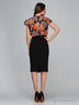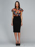 Отрезное по линии талии комбинированное платье длиной ниже колена, стилизованное под блузу с юбкой. Изделие с круглой горловиной, спереди вырез "капля. Двойные воланы вместо рукавов напоминают крылышки, этот элемент придает модели утонченности. Линию талии выделяет пояс (пряжка на поясе может отличаться от фотографии). Комбинация тканей в этой модели используется для того, чтобы как можно четче подчеркнуть женскую фигуру, визуально удлиняя ноги. Платье обыграно интересным решением комбинации цветов, несомненно, является трендом сезона.