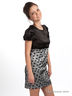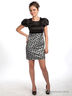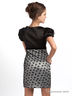 Модель с рукавами-фонариками слегка расклешена. Завышенная линия талии обозначена бархатной лентой. Бисерный бант на полочке.