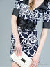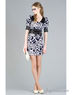 Стильное платье приталенного силуэта. Вырез горловины каре, короткий рукав на манжете. Атласный втачной пояс с бантом, оригинальный рисунок. Отличный вариант для праздников и торжеств.