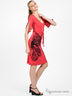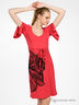Платье женское из мягкого трикотажа. Глубокий V-образный вырез. Декоративные разрезы на рукавах. На уровне талии расположены две шлевки для тонкого пояска. Украшено рисунком-принтом.