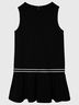 Черный сарафан из джерси трапециевидного силуэта с заниженной линией талии - отличный вариант для будней школьницы. Выполненный из мягкого, но формоустойчивого трикотажного полотна, сарафан практичен, очень удобен в эксплуатации и прост в уходе. Изюминка модели - эластичная тесьма с контрастными полосками, отделяющая верх от присборенной юбки. Это решение, демонстрирующее связь с модным спортивным стилем, придает сарафану свежесть, динамику и остроту.