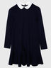 Стильное синее платье с длинным рукавом, выполненное из джерси - прекрасный повседневный вариант. Оригинальность модели придает асимметричный волан, формирующий трапециевидный силуэт и создающий динамику. Съемный белоснежный воротник подчеркивает положительный образ опрятной дисциплинированной девочки. Плотное формоустойчивое трикотажное полотно создает необходимые для девочки комфорт и свободу движений, а также делает платье очень удобным в эксплуатации и уходе.