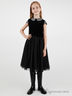 Элегантное черное платье с многослойным объемным подъюбником. Полочка выполнена из нежного бархата, а рукавчики и съемный воротник из шелковистой ткани, оформленной сияющими стразами. В этом замечательном платье юная модница сможет отметить свой день рождения, а также блистать в театре и на светской вечеринке.