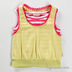 Платье свободного покроя с эффектом двойки. Снизу посажено на трикотажную резинку. Нижняя часть двойки полосатая, с круглой горловиной. Верхняя салатовая, с глубоким вырезом, снизу присборена, по краю оформлена Розовой кружевной тесьмой.
