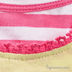 Платье свободного покроя с эффектом двойки. Снизу посажено на трикотажную резинку. Нижняя часть двойки полосатая, с круглой горловиной. Верхняя салатовая, с глубоким вырезом, снизу присборена, по краю оформлена Розовой кружевной тесьмой.