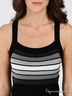 Детали: окантовка выреза каре и пройм в виде трикотажной резинки переходит в бретели; на полочке оригинальная вязка с контрастными вставками