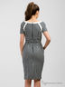 Платье прилегающего силуэта, отрезное по линии талии, с карманами. Рукав реглан короткий. На спинке шлица, длина до колена. Горловина лодочка. На полочке вертикальная черная притачная вставка.