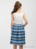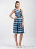 Платье без рукавов, отрезное по талии. Горловина "лодочка с хомутом", по талии - сборка, юбка пышной формы. Спинка из шелка белого цвета. Юбка и полочка платья из шелка полосатого принта сине-голубого цвета.
