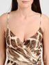 Элегантное платье приталенного силуэта на тонких бретелях. Лиф с запахом, застегивается на молнию на спине. Декорировано принтом и оригинальной драпировкой. Идеально подойдет для вечерних мероприятий и не оставит Вас без внимания.